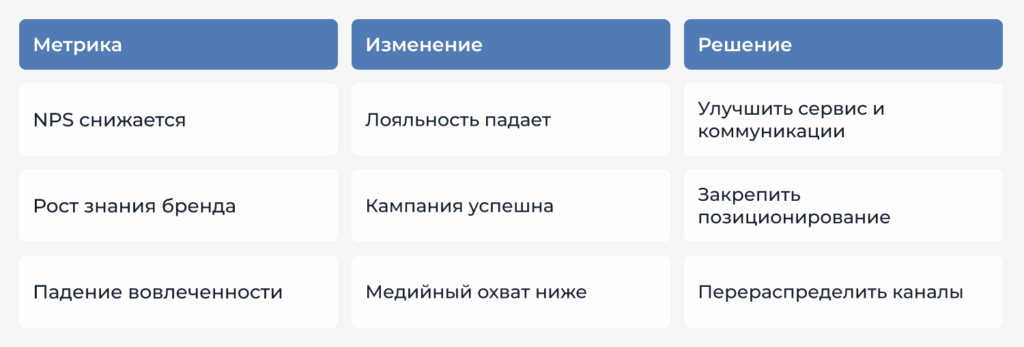 После выявления спада показателей NPS, CSAT или доверия, важно запускать прямые опросы для уточнения причин, быстро тестировать гипотезы, устранять проблемы.